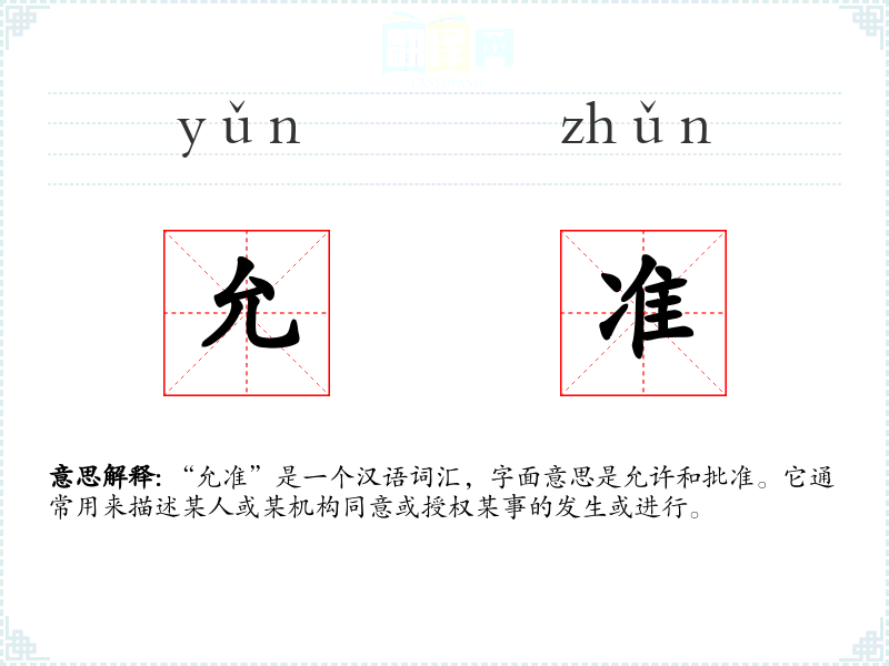 “允准”由两个字组成,“允”意味着允许,“准”意味着批准。这个词在古代汉语中就已经存在,但在现代汉语中,它的使用更加正式和官方。