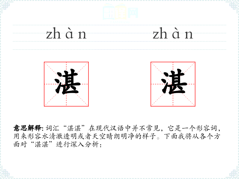 词汇“湛湛”在现代汉语中并不常见,它是一个形容词,用来形容水清澈透明或者天空晴朗明净的样子。下面我将从各个方面对“湛湛”进行深入分析: