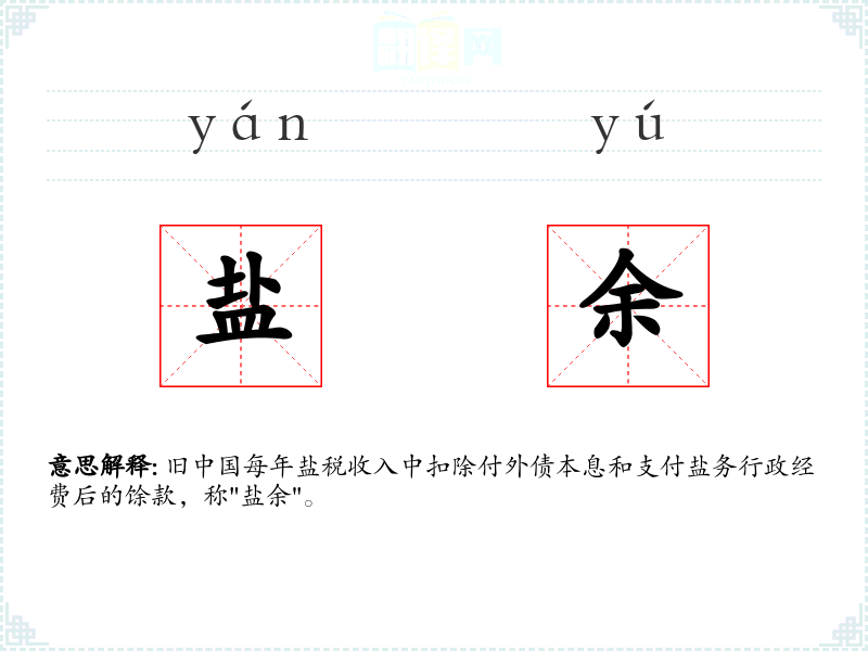 旧中国每年盐税收入中扣除付外债本息和支付盐务行政经费后的馀款,称"盐余"。