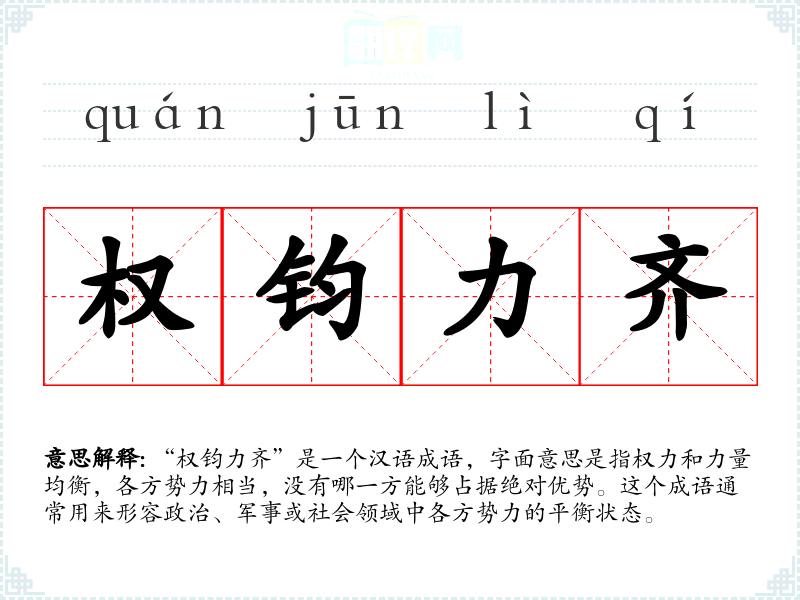 “权钧力齐”是一个汉语成语,字面意思是指权力和力量均衡,各方势力相当,没有哪一方能够占据绝对优势。这个成语通常用来形容政治、军事或社会领域中各方势力的平衡状态。
