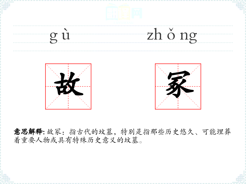“故冢”一词由“故”和“冢”组成。“故”意为旧的、过去的,“冢”指坟墓。在古代文献中,“故冢”常用来指代历史悠久的坟墓,随着时间的推移,这一词汇逐渐被用于更广泛的语境中。