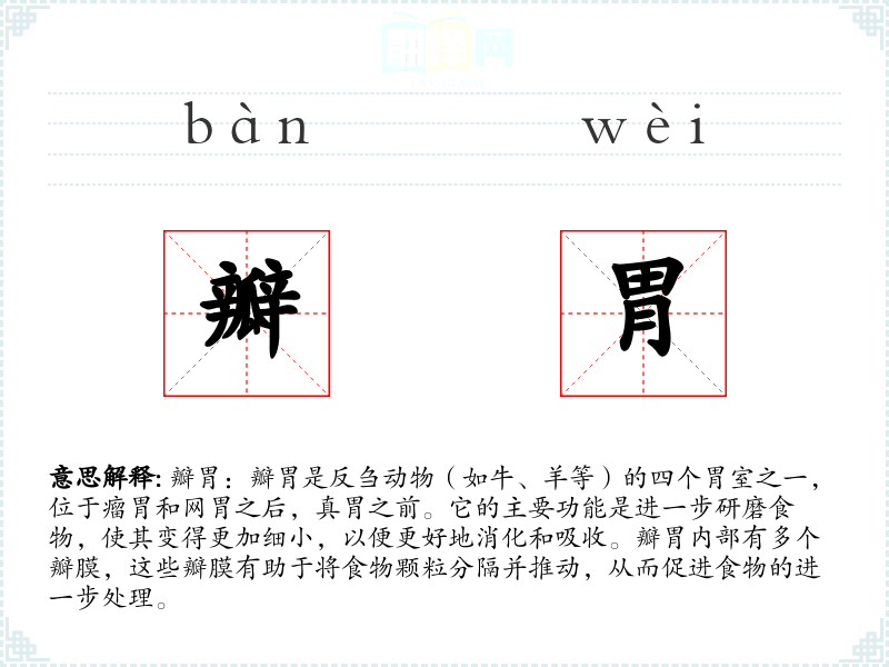 瓣胃一词源自汉语,其中“瓣”指的是分隔的部分,“胃”则是指消化器官。在古代汉语中,可能没有专门指代反刍动物胃部特定部分的词汇,随着科学的发展,这类专业术语逐渐形成并被广泛使用。