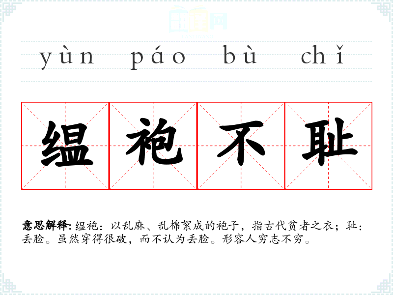 缊袍:以乱麻、乱棉絮成的袍子,指古代贫者之衣;耻:丢脸。虽然穿得很破,而不认为丢脸。形容人穷志不穷。