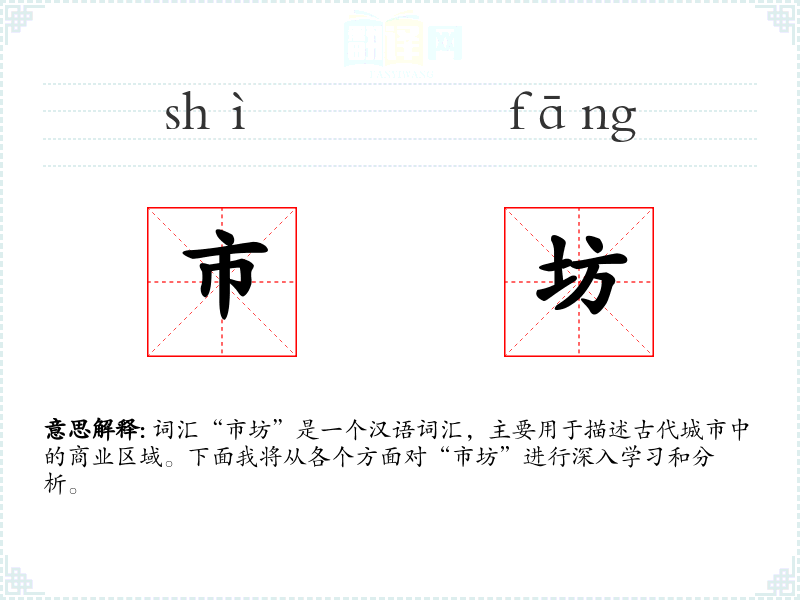“市坊”作为一个描述古代城市商业区域的词汇,虽然在现代汉语中使用较少,但在研究历史、文化和社会发展时,它仍然是一个重要的概念。通过学*和分析“市坊”,我们可以更好地理解古代城市的经济活动和社会结构。