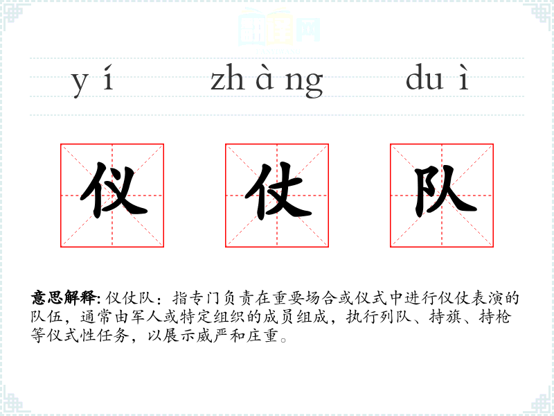 仪仗队:指专门负责在重要场合或仪式中进行仪仗表演的队伍,通常由军人或特定组织的成员组成,执行列队、持旗、持枪等仪式性任务,以展示威严和庄重。
