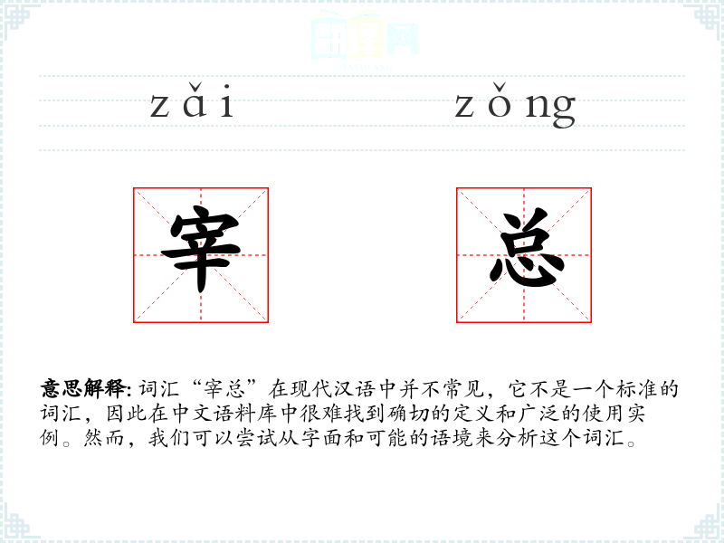 结合这两个字,“宰总”可能指的是一个高级的、有权力的职位或人物,类似于“总管”或“总裁”。