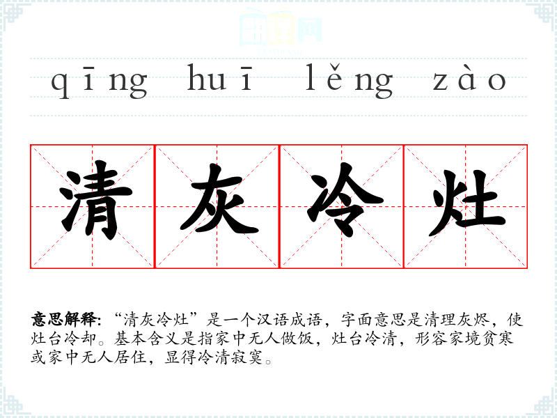 “清灰冷灶”是一个汉语成语,字面意思是清理灰烬,使灶台冷却。基本含义是指家中无人做饭,灶台冷清,形容家境贫寒或家中无人居住,显得冷清寂寞。