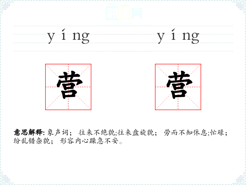 象声词; 往来不绝貌;往来盘旋貌; 劳而不知休息;忙碌; 纷乱错杂貌; 形容内心躁急不安。