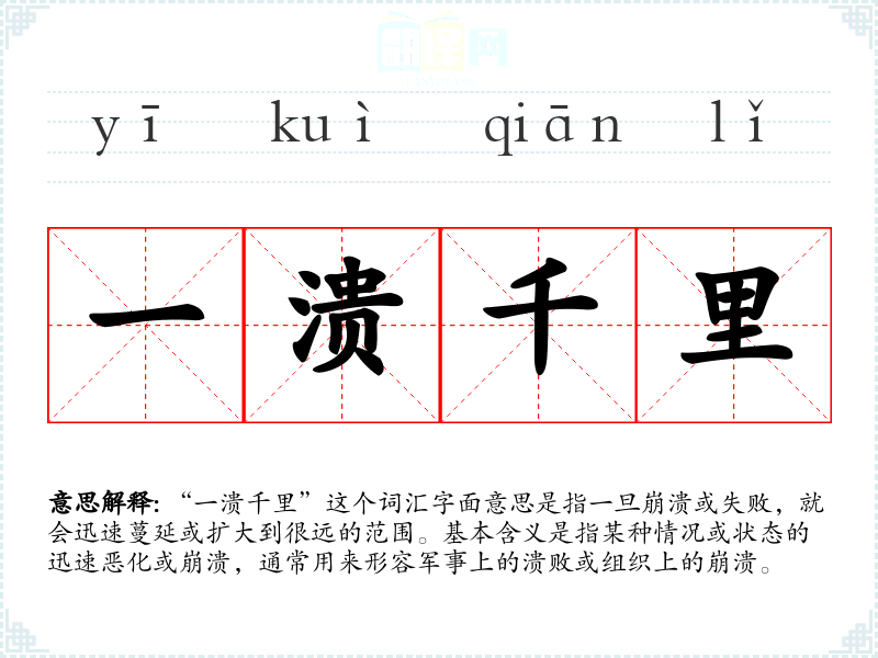 “一溃千里”这个词汇字面意思是指一旦崩溃或失败,就会迅速蔓延或扩大到很远的范围。基本含义是指某种情况或状态的迅速恶化或崩溃,通常用来形容军事上的溃败或组织上的崩溃。