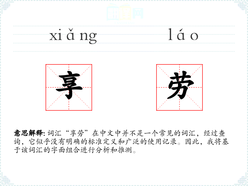“享劳”字面意思可能是指享受劳动的成果或过程。其中,“享”通常表示享受、享有,而“劳”则指劳动、努力。结合起来,这个词可能表达的是一种积极的态度,即享受通过劳动获得的东西或劳动本身带来的满足感。