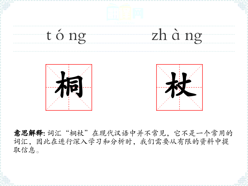 词汇“桐杖”在现代汉语中并不常见,它不是一个常用的词汇,因此在进行深入学*和分析时,我们需要从有限的资料中提取信息。