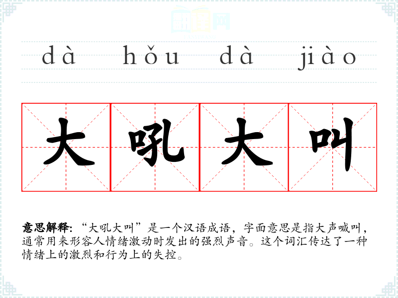 “大吼大叫”是一个汉语成语,字面意思是指大声喊叫,通常用来形容人情绪激动时发出的强烈声音。这个词汇传达了一种情绪上的激烈和行为上的失控。