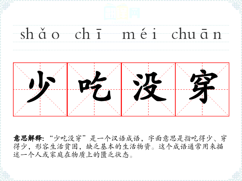 “少吃没穿”是一个汉语成语,字面意思是指吃得少、穿得少,形容生活贫困,缺乏基本的生活物资。这个成语通常用来描述一个人或家庭在物质上的匮乏状态。