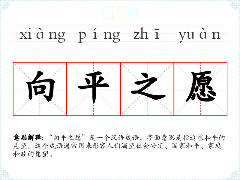 “向平之愿”是一个汉语成语,字面意思是指追求和平的愿望。这个成语通常用来形容人们渴望社会安定、国家和平、家庭和睦的愿望。