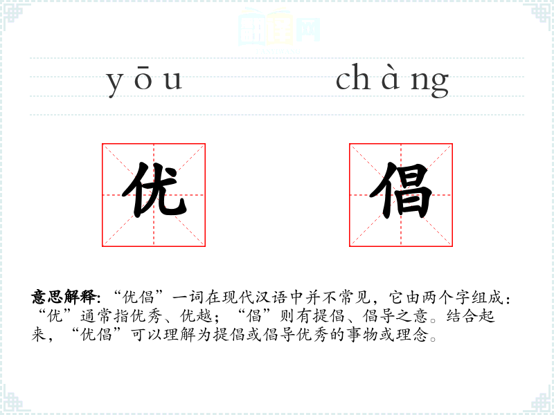 “优倡”一词在现代汉语中并不常见,它由两个字组成:“优”通常指优秀、优越;“倡”则有提倡、倡导之意。结合起来,“优倡”可以理解为提倡或倡导优秀的事物或理念。