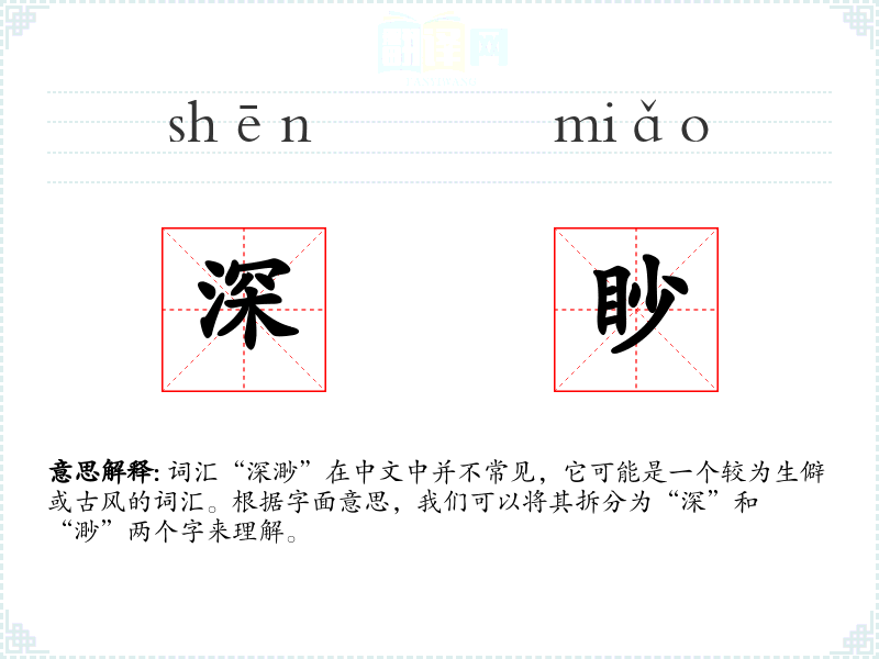 词汇“深渺”在中文中并不常见,它可能是一个较为生僻或古风的词汇。根据字面意思,我们可以将其拆分为“深”和“渺”两个字来理解。