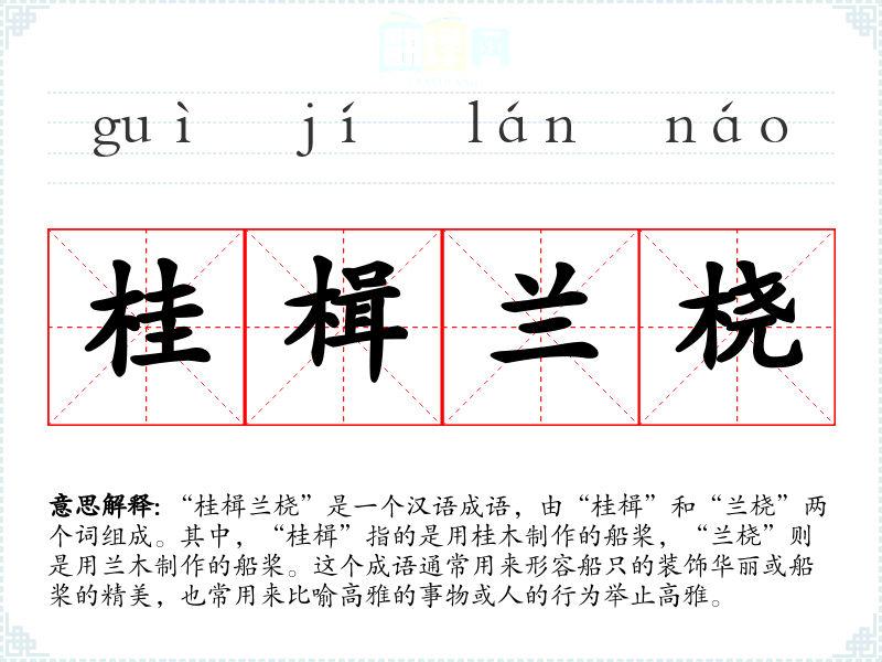 “桂楫兰桡”是一个汉语成语,由“桂楫”和“兰桡”两个词组成。其中,“桂楫”指的是用桂木制作的船桨,“兰桡”则是用兰木制作的船桨。这个成语通常用来形容船只的装饰华丽或船桨的精美,也常用来比喻高雅的事物或人的行为举止高雅。
