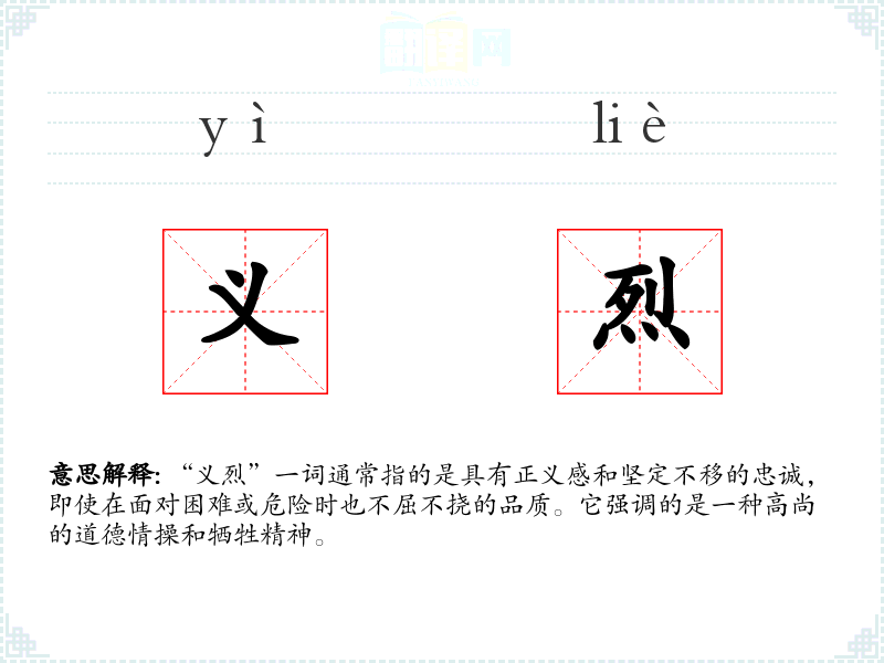 “义烈”一词通常指的是具有正义感和坚定不移的忠诚,即使在面对困难或危险时也不屈不挠的品质。它强调的是一种高尚的道德情操和牺牲精神。