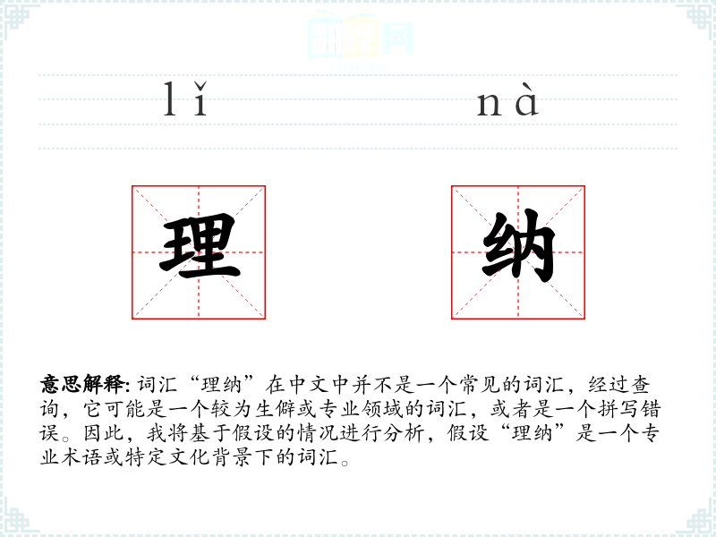 词汇“理纳”在中文中并不是一个常见的词汇,经过查询,它可能是一个较为生僻或专业领域的词汇,或者是一个拼写错误。因此,我将基于假设的情况进行分析,假设“理纳”是一个专业术语或特定文化背景下的词汇。