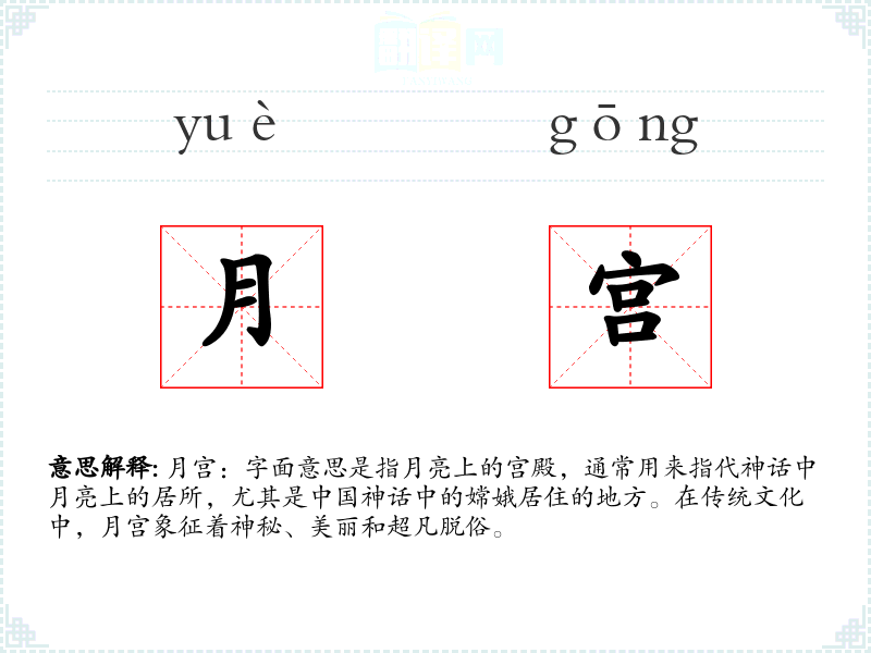 月宫:字面意思是指月亮上的宫殿,通常用来指代神话中月亮上的居所,尤其是**神话中的嫦娥居住的地方。在传统文化中,月宫象征着神秘、美丽和超凡脱俗。