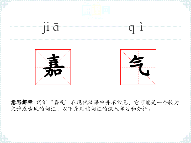 词汇“嘉气”在现代汉语中并不常见,它可能是一个较为文雅或古风的词汇。以下是对该词汇的深入学*和分析: