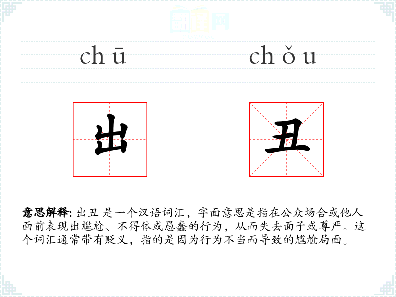 出丑 是一个汉语词汇,字面意思是指在公众场合或他人面前表现出尴尬、不得体或愚蠢的行为,从而失去面子或尊严。这个词汇通常带有贬义,指的是因为行为不当而导致的尴尬局面。