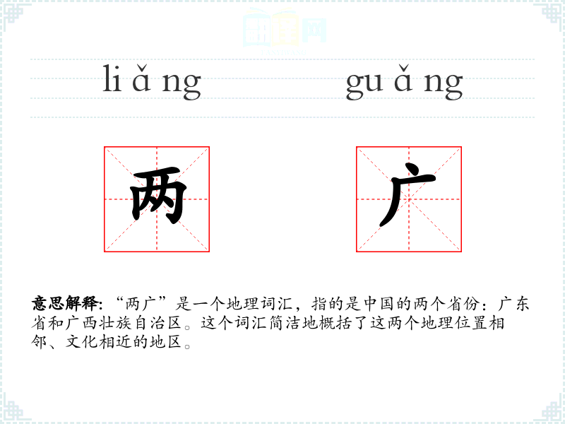 - 同义词:粤桂(特指广东省和广西壮族自治区)