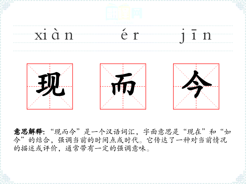 “现而今”是由“现”和“今”两个字组合而成,这两个字在古代汉语中就已经存在,表示“现在”的意思。随着时间的推移,这种组合形式被用来强调当前的时间点,形成了“现而今”这一表达方式。