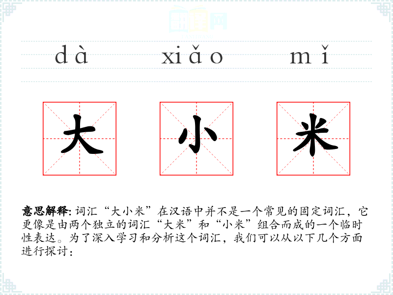 - “大小米”作为一个词汇组合,虽然在日常语言中不常见,但它体现了汉语的灵活性和表达的多样性。