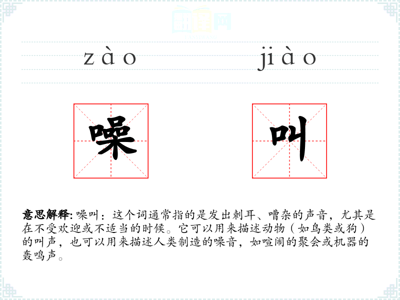噪叫:这个词通常指的是发出刺耳、嘈杂的声音,尤其是在不受欢迎或不适当的时候。它可以用来描述动物(如鸟类或狗)的叫声,也可以用来描述人类制造的噪音,如喧闹的聚会或机器的轰鸣声。