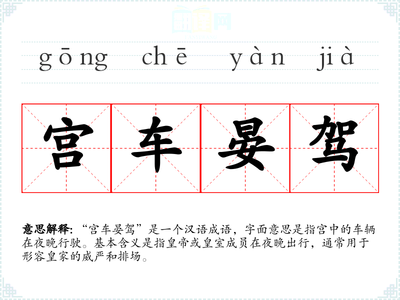 “宫车晏驾”是一个汉语成语,字面意思是指宫中的车辆在夜晚行驶。基本含义是指**或皇室成员在夜晚出行,通常用于形容皇家的威严和排场。