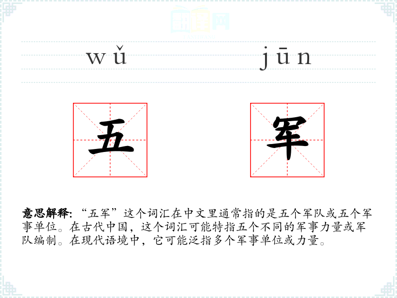 “五军”这个词汇不仅是一个简单的军事术语,它还承载了丰富的历史和文化信息。在学*语言和表达时,理解这样的词汇可以帮助我们更深入地了解和欣赏语言背后的文化和历史。
