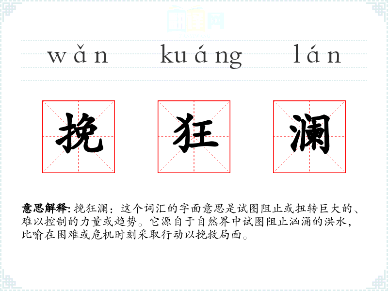 挽狂澜:这个词汇的字面意思是试图阻止或扭转巨大的、难以控制的力量或趋势。它源自于自然界中试图阻止汹涌的洪水,比喻在困难或危机时刻采取行动以挽救局面。