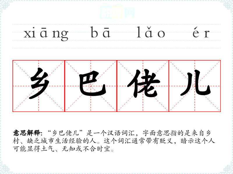 “乡巴佬儿”是一个汉语词汇,字面意思指的是来自乡村、缺乏城市生活经验的人。这个词汇通常带有贬义,暗示这个人可能显得土气、无知或不合时宜。