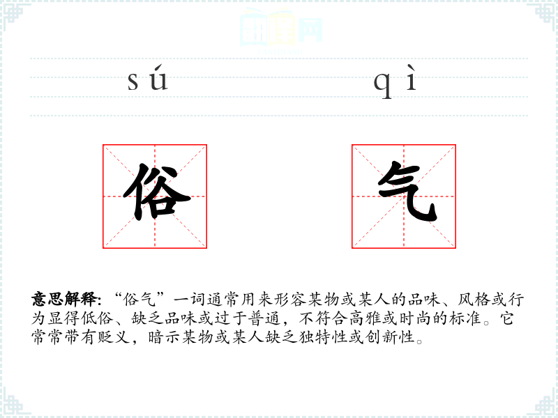 “俗气”一词通常用来形容某物或某人的品味、风格或行为显得低俗、缺乏品味或过于普通,不符合高雅或时尚的标准。它常常带有贬义,暗示某物或某人缺乏独特性或创新性。