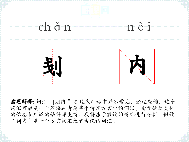 假设“刬内”是一个方言词汇,它的字面意思可能是“铲除内部”或“清理内部”,具体含义需要根据方言的具体语境来确定。