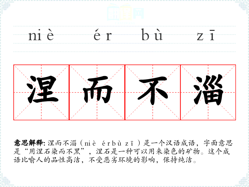 涅而不淄(niè ér bù zī)是一个汉语成语,字面意思是“用涅石染而不黑”,涅石是一种可以用来染色的矿物。这个成语比喻人的品性高洁,不受恶劣环境的影响,保持纯洁。