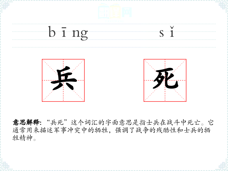 “兵死”这个词汇的字面意思是指士兵在战斗中死亡。它通常用来描述军事冲突中的牺牲,强调了战争的残酷性和士兵的牺牲精神。