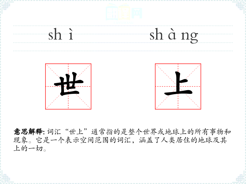 词汇“世上”通常指的是整个世界或地球上的所有事物和现象。它是一个表示空间范围的词汇,涵盖了人类居住的地球及其上的一切。