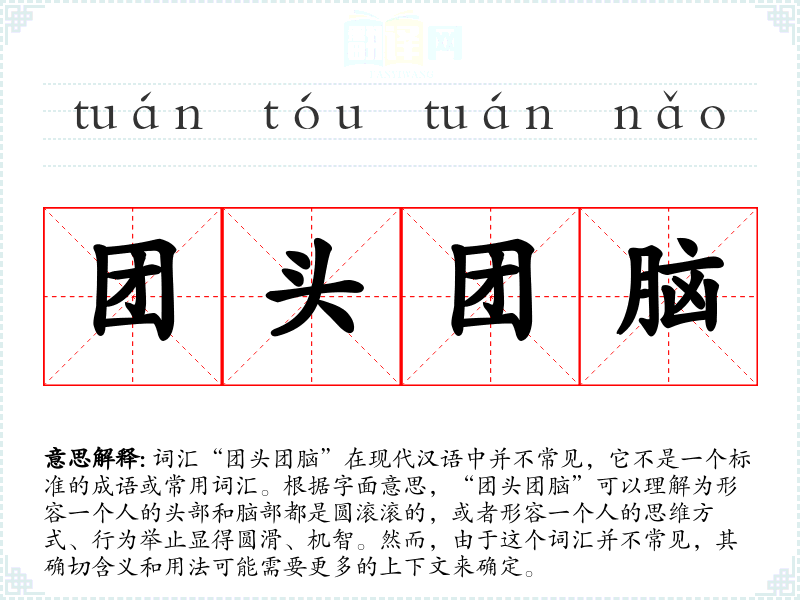 词汇“团头团脑”在现代汉语中并不常见,它不是一个标准的成语或常用词汇。根据字面意思,“团头团脑”可以理解为形容一个人的头部和脑部都是圆滚滚的,或者形容一个人的思维方式、行为举止显得圆滑、机智。然而,由于这个词汇并不常见,其确切含义和用法可能需要更多的上下文来确定。