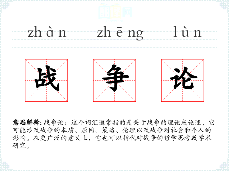 “战争论”是一个深刻且多维的词汇,它不仅涉及战争的理论和实践,还触及到伦理、政治和文化等多个层面。在我的语言学习和表达中,理解和运用这个词汇有助于我更深入地思考战争的本质和影响。