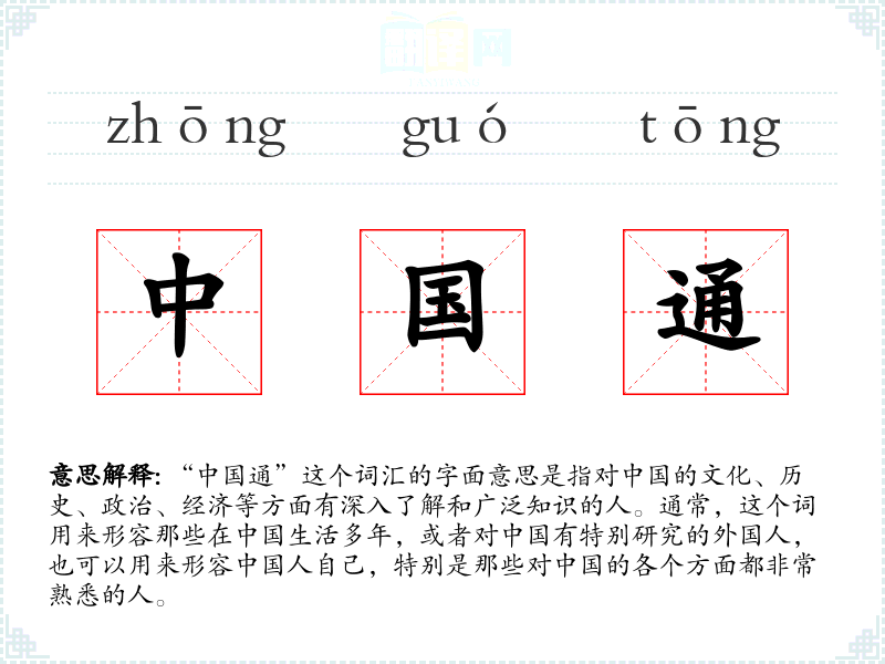 “通”这个词汇的字面意思是指对的文化、历史、政治、经济等方面有深入了解和广泛知识的人。通常,这个词用来形容那些在生活多年,或者对有特别研究的外国人,也可以用来形容人自己,特别是那些对的各个方面都非常熟悉的人。