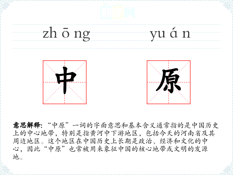 - 反义词:边疆、外围(这些词汇与“中原”相对,指远离中心的地带)