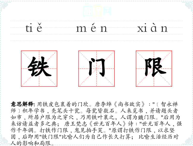1.用铁皮包裹着的门坎。唐李绰《尚书故实》﹕"﹝智永禅师﹞积年学书﹐秃笔头十瓮。每瓮皆数石。人来觅书﹐并请题头者如市﹐所居户限为之穿穴﹐乃用铁叶裹之,人谓为鐡门限。"后用为来访请益者多之典; 唐王梵志《世无百年人》诗﹕"世无百年人﹐强作千年调。打铁作门限﹐鬼见拍手笑。"原谓打铁作门限﹐以求坚固﹐后即用"铁门限"比喻人们为自己作长久打算; 比喻生活经历对人的影响和局限。