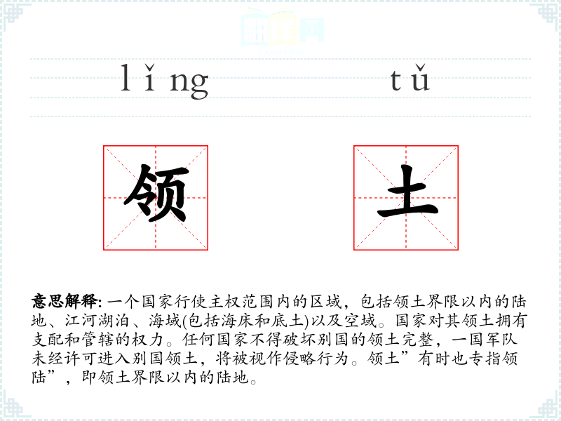 1.一个国家行使主权范围内的区域,包括领土界限以内的陆地、江河湖泊、海域(包括海床和底土)以及空域。国家对其领土拥有支配和管辖的权力。任何国家不得破坏别国的领土完整,一国军队未经许可进入别国领土,将被视作侵略行为。领土”有时也专指领陆”,即领土界限以内的陆地。