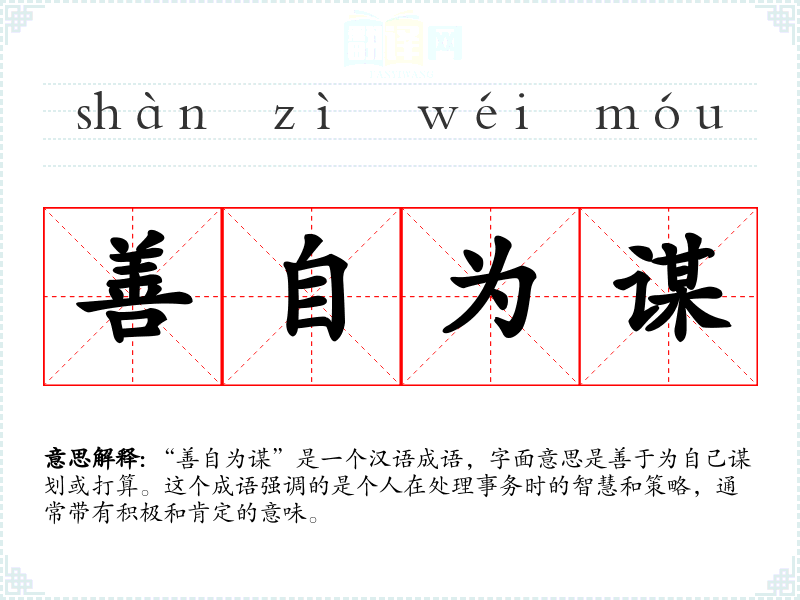 “善自为谋”是一个汉语成语,字面意思是善于为自己谋划或打算。这个成语强调的是个人在处理事务时的智慧和策略,通常带有积极和肯定的意味。