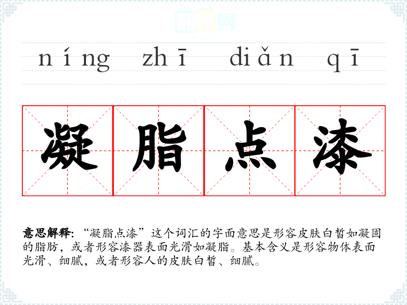 “凝脂点漆”这个词汇的字面意思是形容皮肤白皙如凝固的脂肪,或者形容漆器表面光滑如凝脂。基本含义是形容物体表面光滑、细腻,或者形容人的皮肤白皙、细腻。