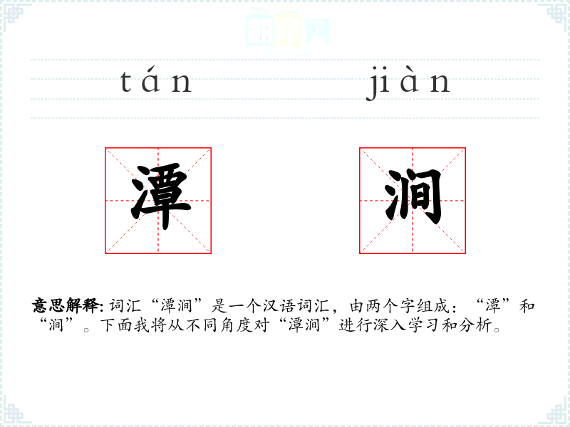 - 词源:“潭”和“涧”都是古代汉语词汇,源自对自然地貌的描述。