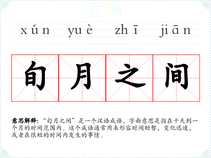 “旬月之间”是一个汉语成语,字面意思是指在十天到一个月的时间范围内。这个成语通常用来形容时间短暂,变化迅速,或者在很短的时间内发生的事情。