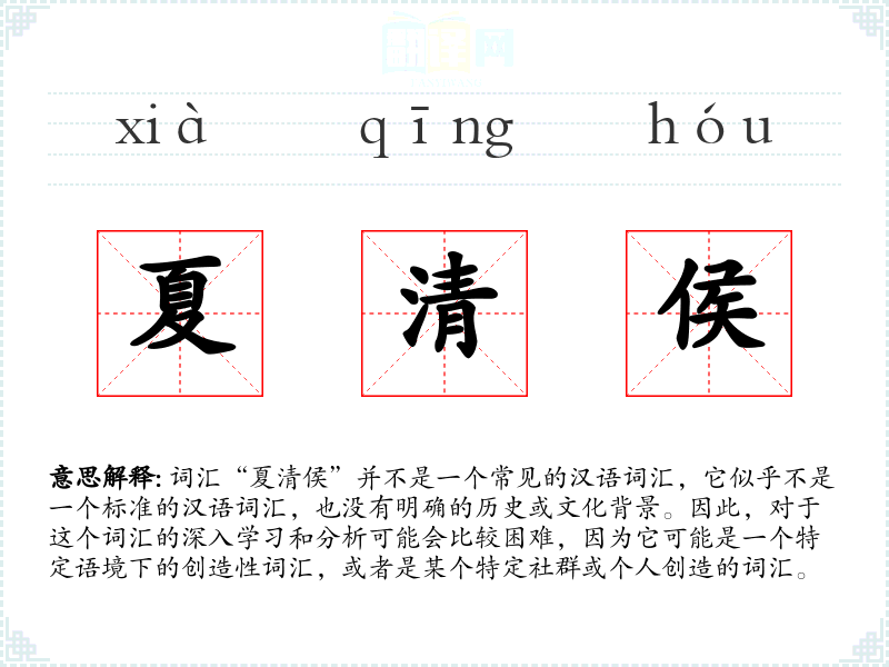 由于“夏清侯”不是一个标准词汇,我们无法给出一个确切的基本定义。它可能是由“夏”、“清”和“侯”三个字组合而成的,每个字都有自己的含义,但组合在一起并没有明确的意义。